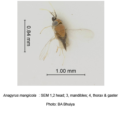 In Bangladesh this parasitoid was first recorded by this author in 1984 from Patiya, Chittagong, as an undescribed species of Anagyrus. The specimen was later described by J. S. Noyes of the Natural History Museum, London as Anagyrus mangicola (Noyes, 1990a; Bhuiya et al., 1997). Specimens collected from Bangladesh and India were reared in England and in Bangladesh. The Bangladeshi specimens were included as paratypes and were deposited in BMNH (Noyes, 1990a). |